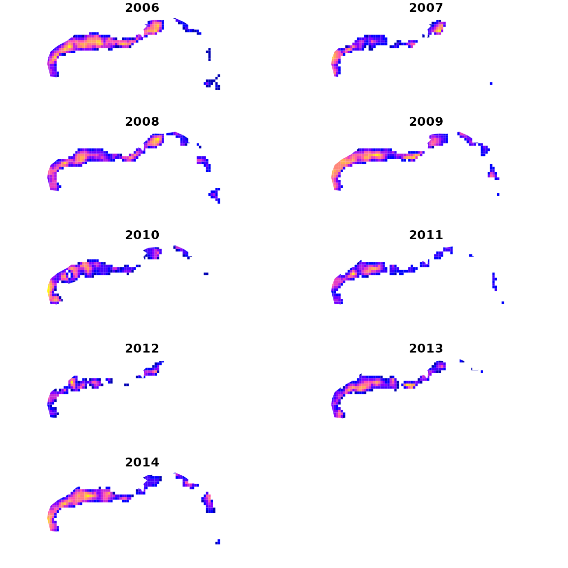 colnames(plot_grid) = colnames(index) = sort(unique(red_snapper$Year))We then plot densities in each year