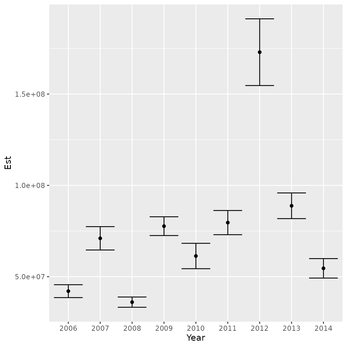 ggplot( data.frame("Year"=colnames(index),"Est"=index[1,],"SE"=index[2,]) ) +