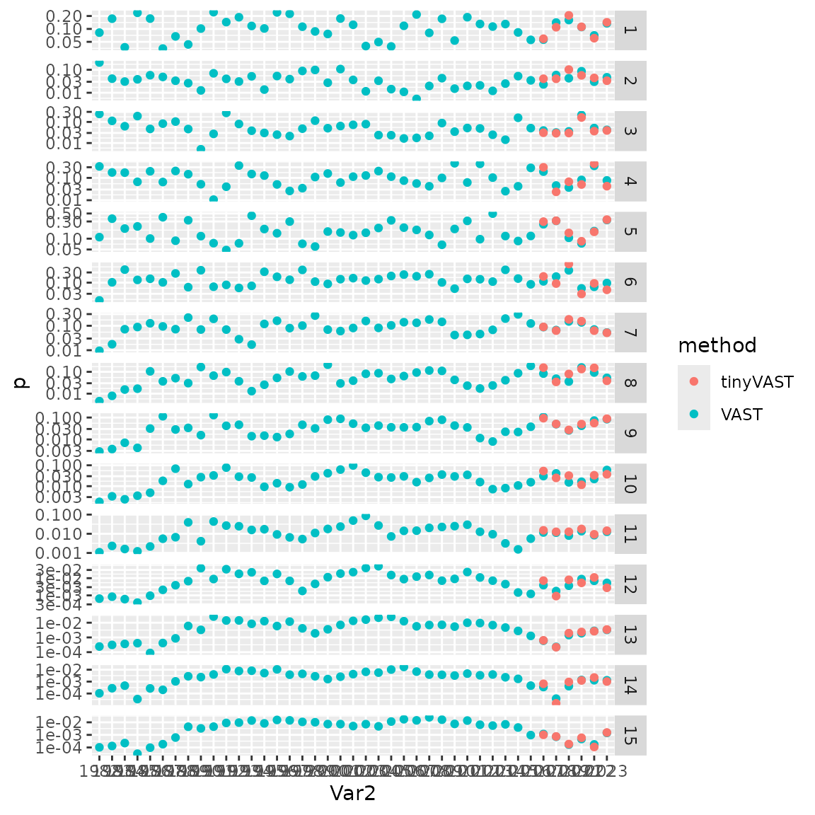 Finally, we can compare these estimates with those from package VAST (Thorson and Barnett 2017). Estimates differ somewhat because VAST used a delta-gamma distribution with spatio-temporal variation in two linear predictors, used a different mesh, and we also skipped epsilon bias-correction for tinyVAST to have a faster-running vignette.
