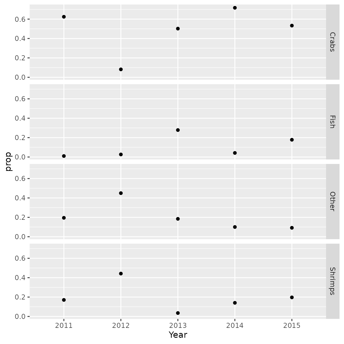 )Finally, we can loop across prey to get the proportions by year and prey. Here, we do this manually (i.e., without bias-correction or standard errors) to save computation time.