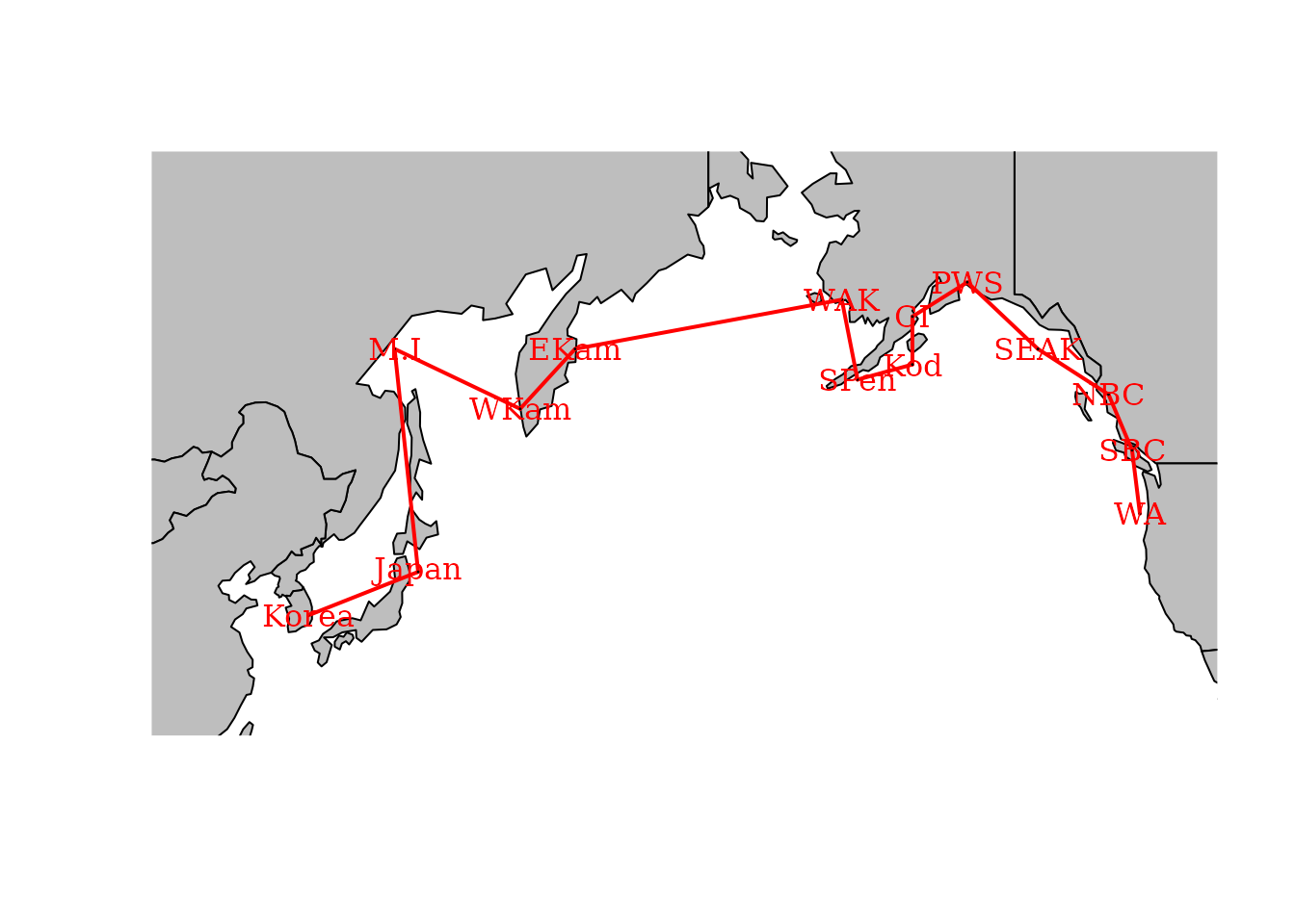 SEAK - NBC - SBC - WA )We can plot this adjacency on a map to emphasize that it is a simple way to encode information about spatial proximity: